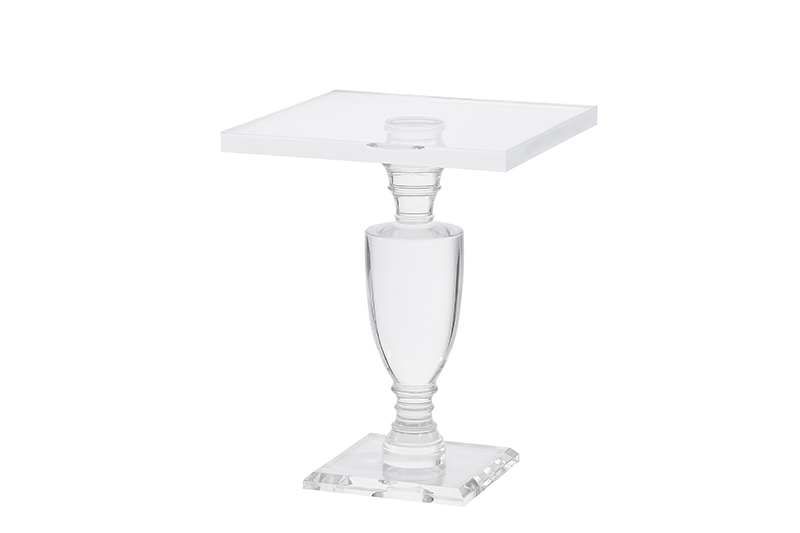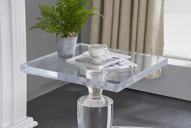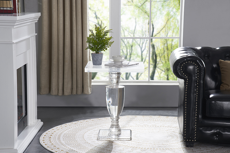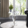 Chiếc bàn tròn nhỏ được làm hoàn toàn từ nhựa acrylic cao cấp, nổi bật với vẻ đẹp trong suốt và thiết kế thanh mảnh. Phần chân bàn được tạo hình uốn lượn nhẹ nhàng, mang đến cảm giác cổ điển pha lẫn hiện đại, phù hợp dùng làm bàn trang trí, bàn đặt đèn, hoặc bàn phụ bên sofa.