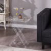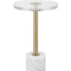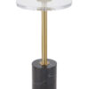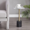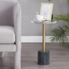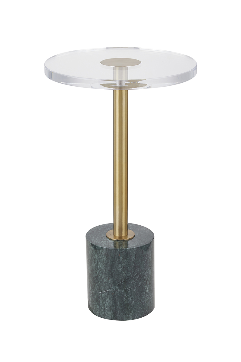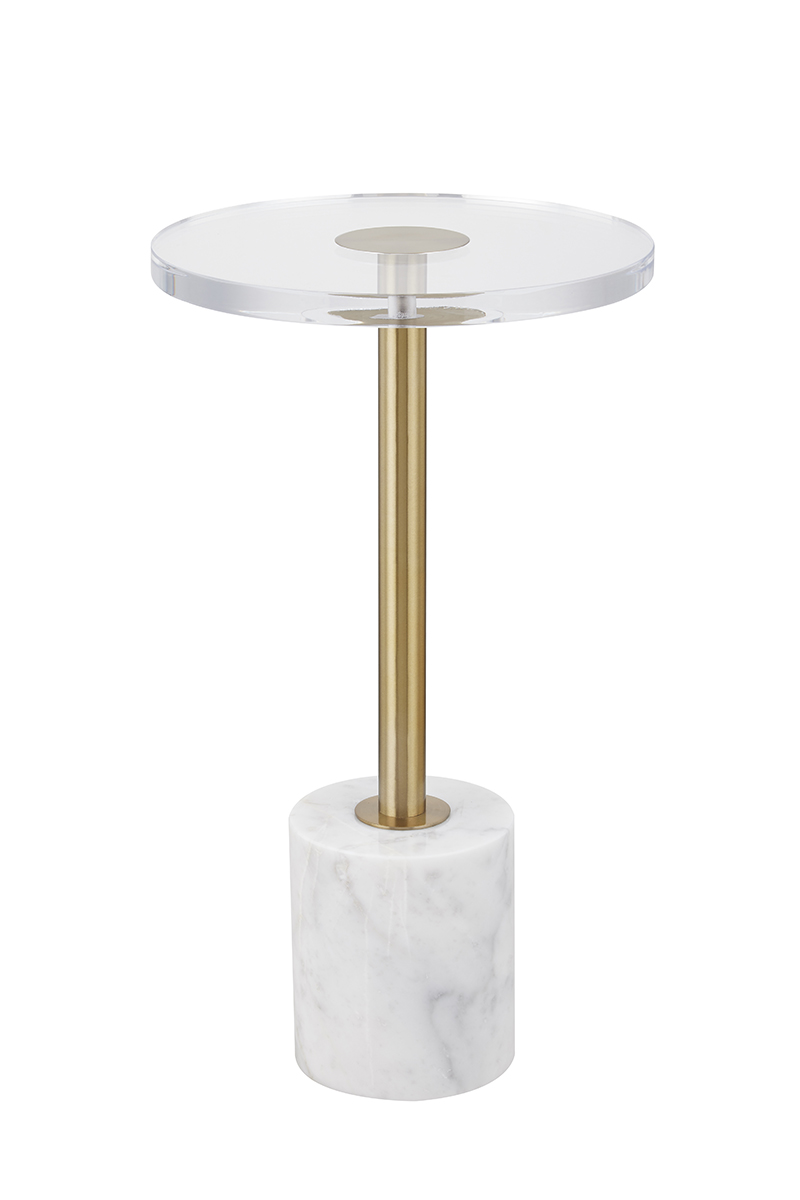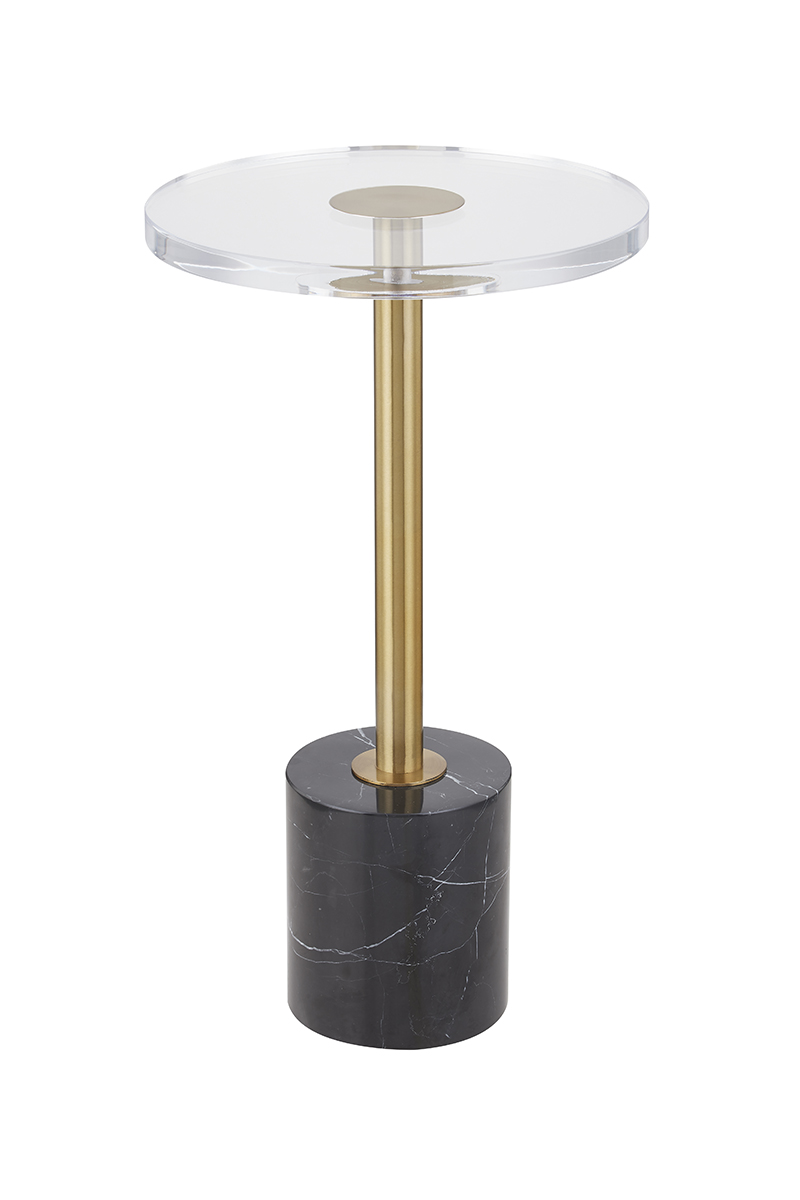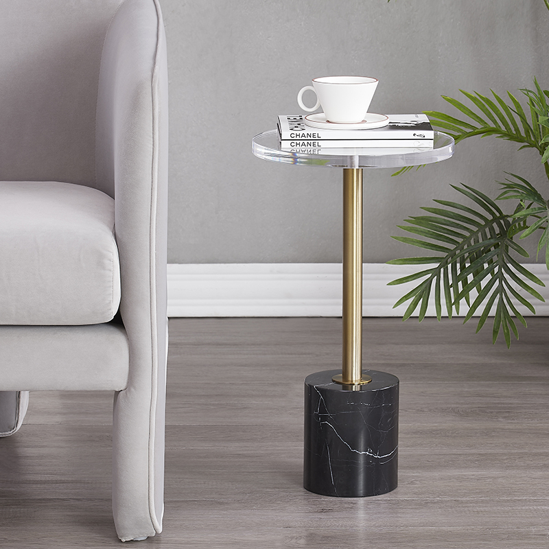 Chiếc bàn đầu giường hiện đại với mặt bàn trong suốt, chân trụ mạ vàng và đế đá cẩm thạch trắng – một lựa chọn tinh tế cho không gian sống đẳng cấp. Hoàn hảo để đặt đồ uống, đồ ăn nhẹ hoặc trang trí.